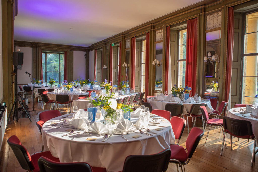 The spaces in our wedding package include the Great Hall, Long Room, Round Room and the attractive Oaken Panelled Room, one fully equipped kitchen, a preparation kitchen and a wash-up kitchen. The Long Room and the outdoor garden with open air stage make a beautiful backdrop for photographs. There is also a quiet room to get changed in, as well as a registrar’s room. A classical folly adjacent to our Walled Garden and orchards enhances the eastern view from the terrace and is also great for photographs.
